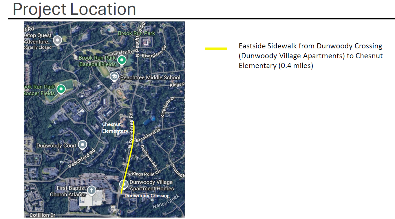 City staff are recommending moving forward with a Safe Routes to School sidewalk project on the east side of North Peachtree Road, running from the Dunwoody Crossing apartments to Chesnut Elementary School—approximately 0.4 miles.