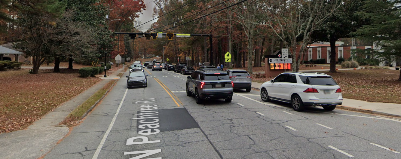 North Peachtree Road during school pickup — a busy corridor where safer sidewalks matter.